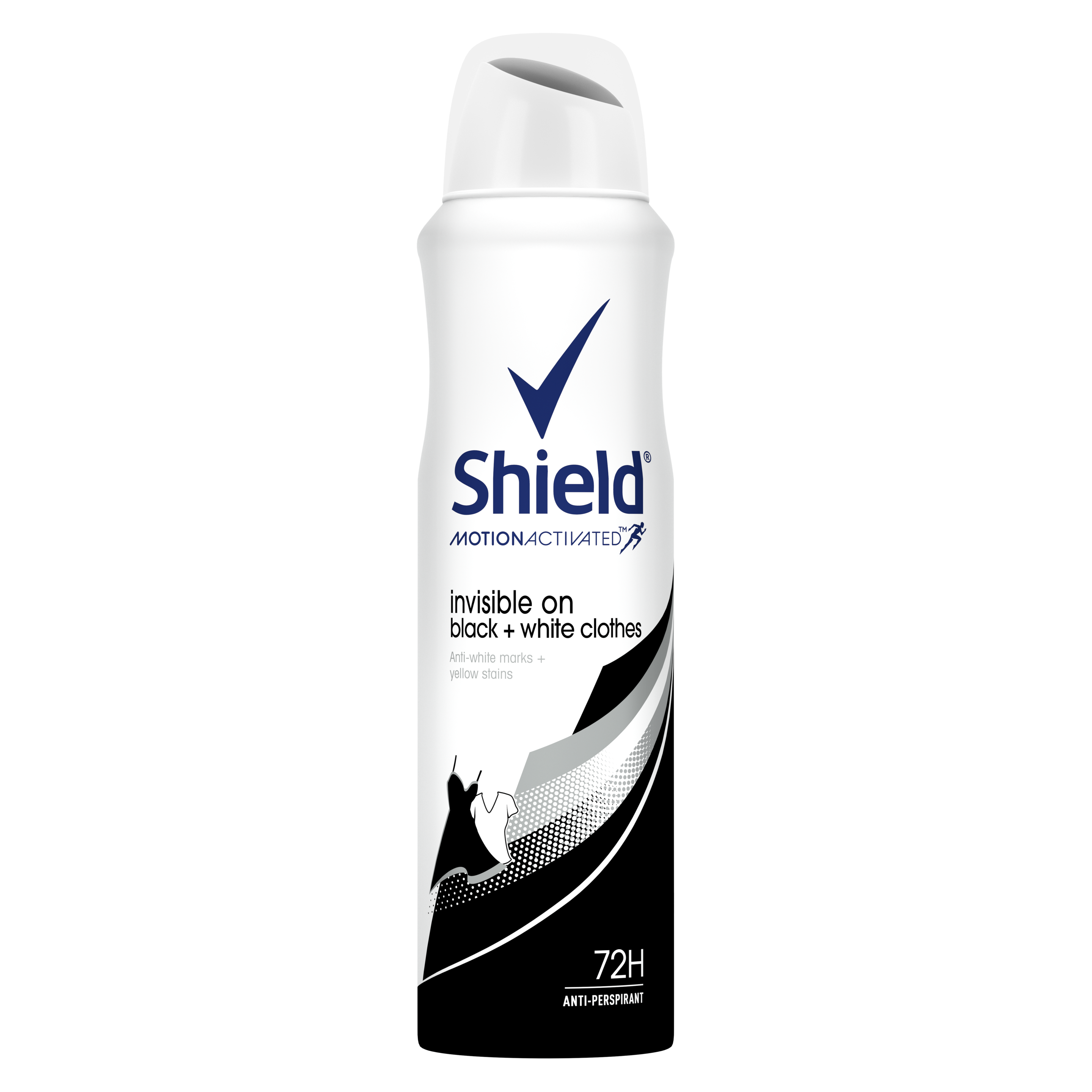 The perfect little black dress. The crisp white work shirt. The last thing you want from your deodorant is white marks or yellow stains on your favourite outfit. Shield Women Invisible Black and White Antiperspirant Deodorant Body Spray protects against perspiration and stops the build-up that can lead to stains on your clothes. Shield's Anti-Mark technology works to prevent yellow stains on white clothes and white marks on dark fabrics. Life is too full of good things to waste time sweating the small stuff. Shield deodorant keeps you covered, so you don't have to worry about perspiration or about stained clothes. For an active lifestyle, choose Shield Antiperspirant for 72-hour non-stop protection against sweat. Get the kids to school on time, hit the gym, ace that presentation, enjoy lunch with the ladies and stay fresh and elegant for date night. It's no problem when you've got Shield antiperspirant deodorant to keep you cool, dry and confident all day long. Shield's MotionActivated formulation works harder the more you move, so keep moving and let Shield keep you protected. Stay cool and dry, without thinking twice about your clothing. Shield Invisible provides advanced protection against white marks and yellow stains, so white clothes stay white and black clothes stay black. Try Shield. It won't let you down.